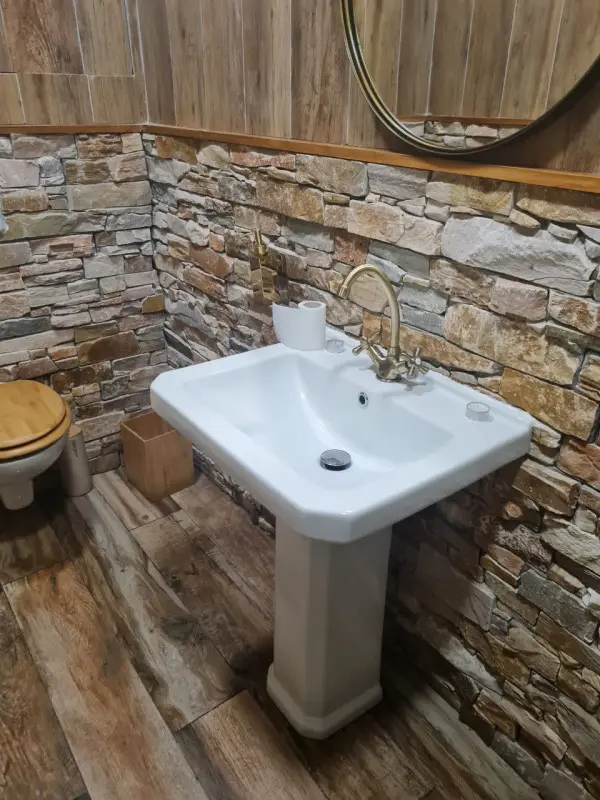 Le parti pris décoratif s'est orienté vers l'alliance du minéral et du végétal. Nous avons posé un élégant parement mural effet pierre sur la partie basse des murs, contrastant parfaitement avec la faïence imitation bois de la partie supérieure. Au sol, le carrelage imitation parquet prolonge cette ambiance naturelle tout en garantissant un entretien facile.